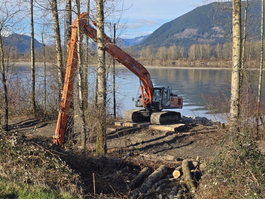 This site is doing some reclamation work beside a river, the ground is generally poor quality, saturated and soft. The work involves building heavy rock piers into the bank, creating an eddy downriver and helping to stabilize the river’s edge. The rock is delivered by barge and placed by the machine with long reach.