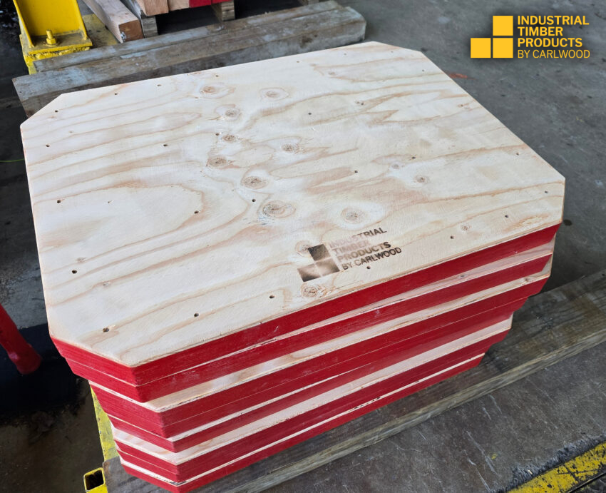 These are 2-1/4″ x 24″ x 32″ Plywood Outrigger Pads, with red edge seal, corners are nipped, no rope handles. Used for blocking by a heavy haul moving company. We can make virtually any size pad!