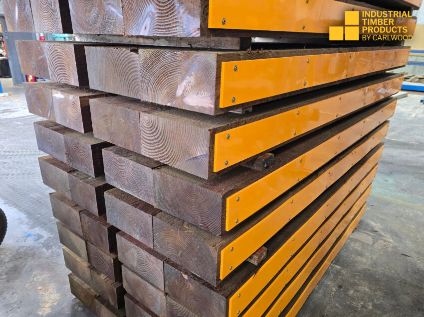 These timber outrigger pads are for a concrete pumping company. We have added 3/8″ side poly protection because the zoom boom operators on site can get a little overzealous pushing the pads in to place, causing damage to the pad/timbers. The pads are 6″ x 48″ x 96″ with daps in the ends for rigging to the rod. They are built from Douglas Fir and are CCA treated for long life.